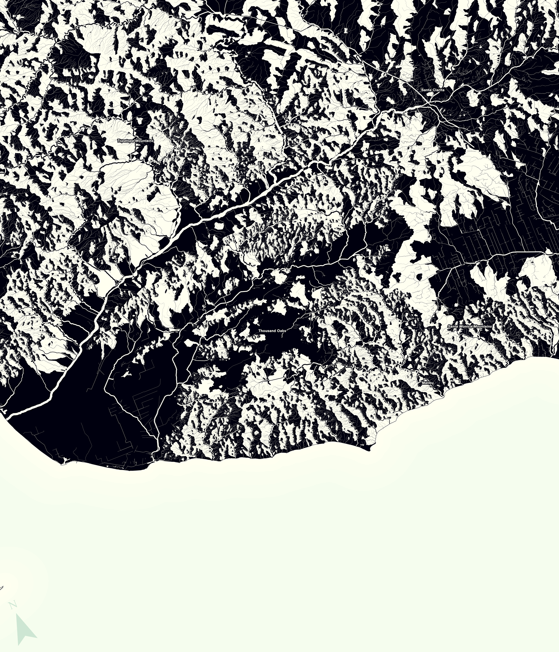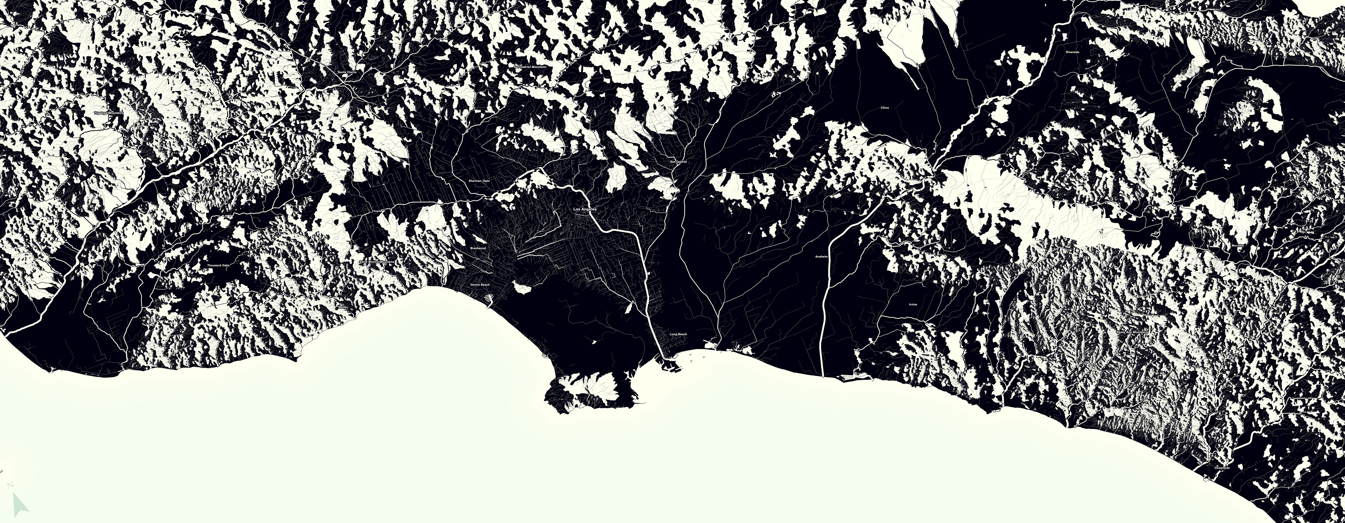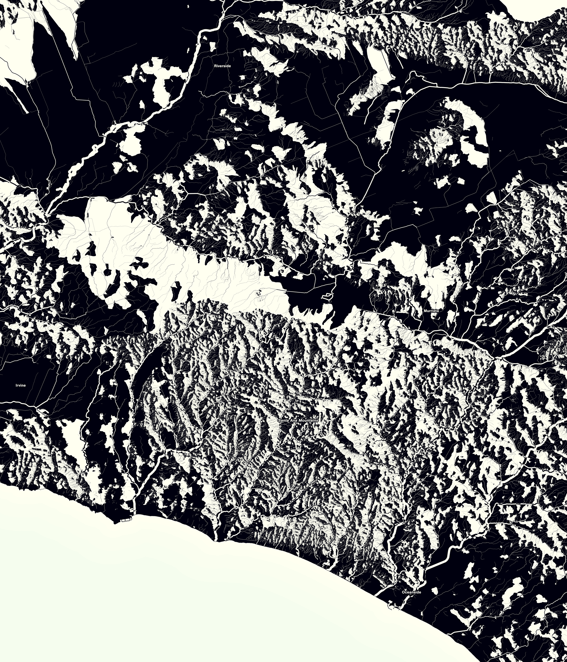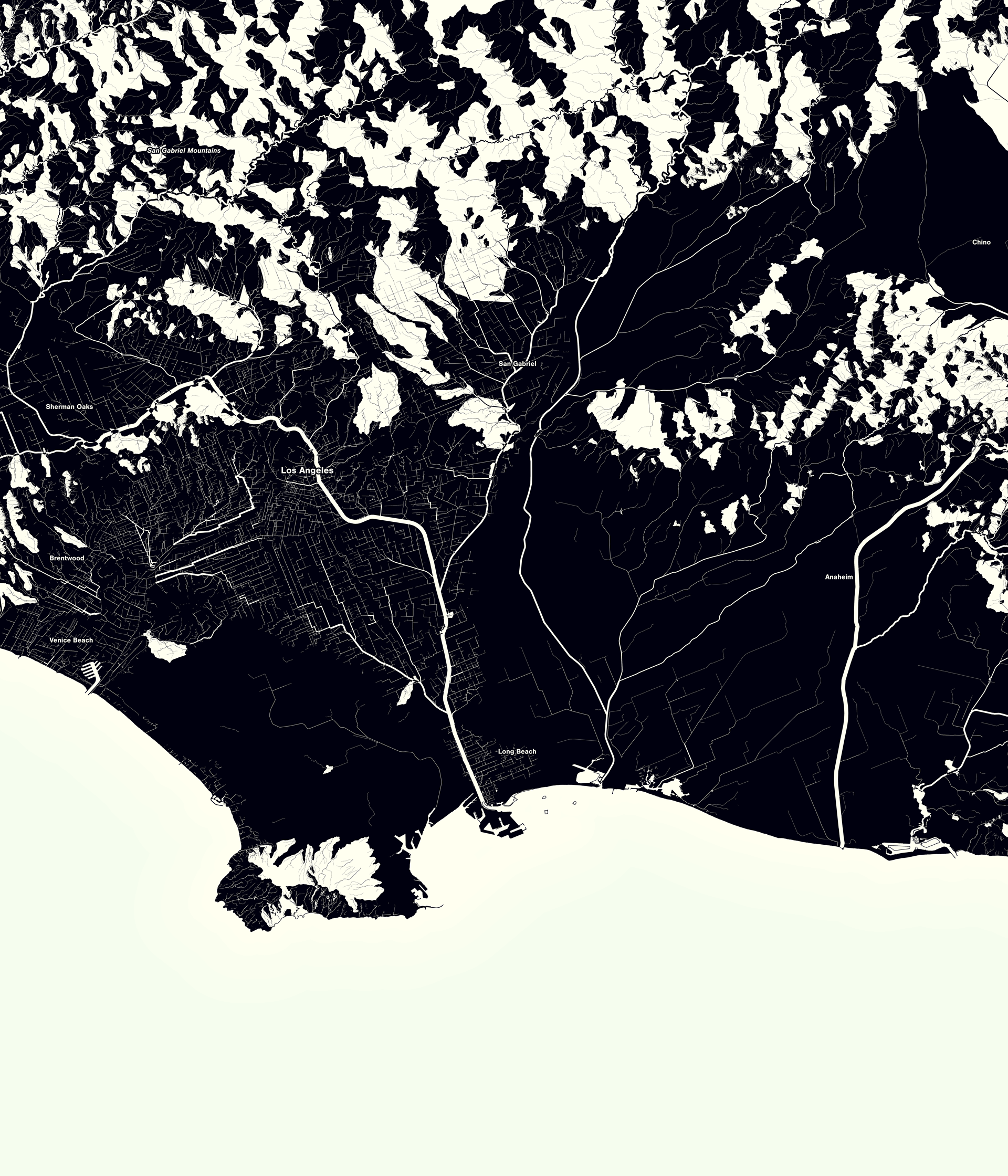 Two-tone maps of terrain and the extensive hydro-logical system in the Los Angeles area. Based on the cartography of Steve Kim.